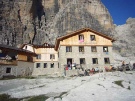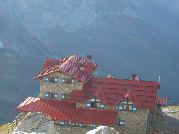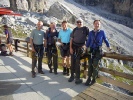 Day 1 Passo del Groste to Rif. Tuckett - Grade 2 seriousness C (Fletcher Smith guidebook) The expedition started in fine weather with the ride up the Groste gondala from Campo Carlo Magno to the top station at Passo del Groste. The via ferrata gear and and helmets were donned for the first time and after a strenuous detour to the top of the peak overlooking the pass (our only peak of the trip), path 305 was followed until the first ferrata sign. The path picked its way through typical limestone desert to the first set of wire protection. A painted sign for the Tuckett hut confirmed we were on the right track as we wound our way along ledges and round corners with wires protecting the most exposed sections. The route descended to Vedretta di Vallesinella Superior and then a series of easy angled snow slope crossings lead to a sign pointed down to the right for the Sentiero B. Delle Giacomo and the Rif. Tuckett. Another hour of descent saw us down at the hut and checking in the for the night. |
