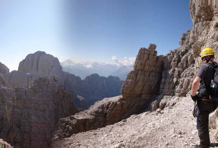 the last via ferrata of our Brenta traverse. A very steep cliff loomed ahead of us
