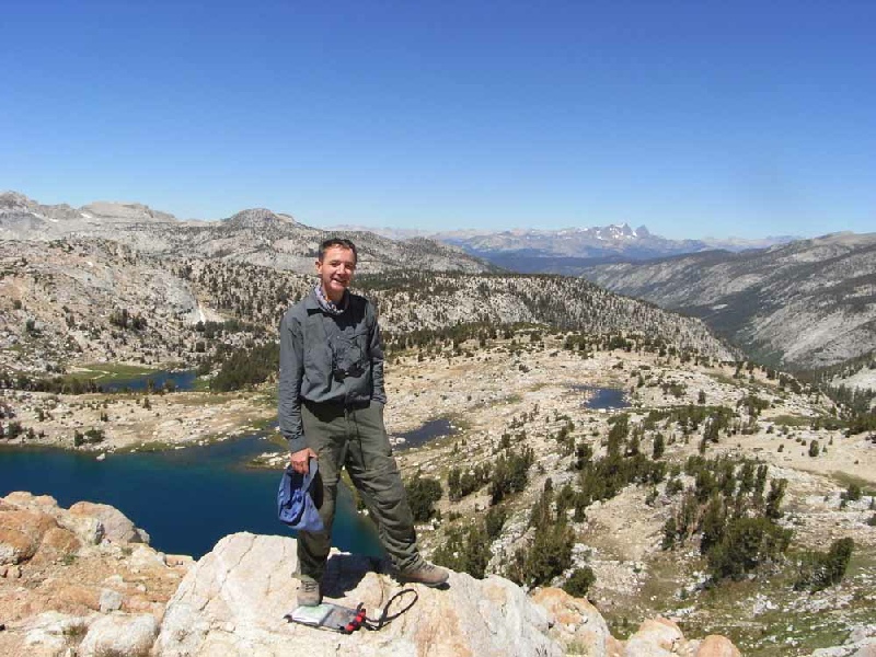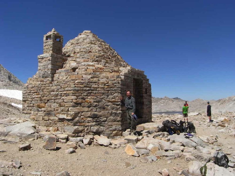 Day 11 McClure Meadow to Big Pete's Meadow Total distance of day 15 miles Total ascent of day 2500ft Today's route ascended the Muir Pass. Standing at 11995ft, this was the highest point so far on the Trail. The high point on the pass is marked by a shelter built by the Sierra Club in 1930 for only emergency use. A series of wonderfully clear lakes were passed on the way to the top of the pass including Evolution, Sapphire and Wanda Lakes. The shelter was reached and I was ready for a welcome snack stop. Jim and Jeremy introduced themselves in the shelter. We compared notes about the weight of our rucksacks and I tried to work out why I was carrying twice as much as they were ! After the pass I entered a barren, impressive and fragile high mountain landscape.