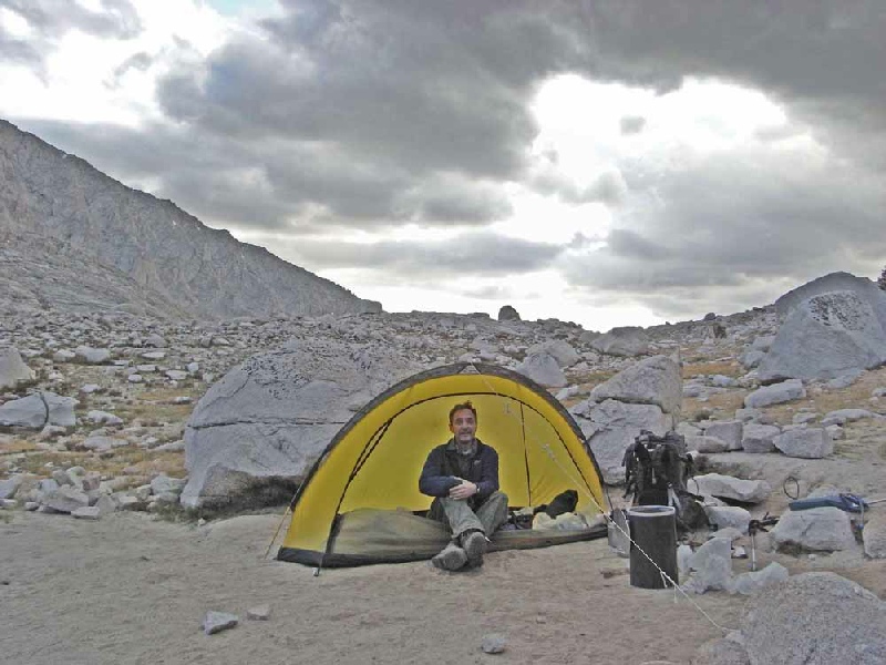 Day 16 Unnamed lake south of Forester Pass to Guitar Lake Total distance of day 14 miles Total ascent of day 1800ft It was a relief that there was no pass to cross today but a relatively gently walk to Guitar Lake, nestled under the final destination of the John Muir Trail, Mount Whitney summit. A fine mix of woods and meadows kept up the interest levels during the day's walk but I was thinking mainly about the climb of Mount Whitney and the finish below at Whitney Portal. A sign was passed indicating 8.3 miles to the top of Mount Whitney and my heart leapt at the thought of getting to the end. The number of trekkers passed was increasing all the time as I got nearer to Mount Whitney with summiteers returning from their successful expeditions. Finally Guitar Lake was reached and I set up my last camp of the JMT. |