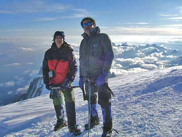 Mont Blanc, the highest summit in Western Europe at 4807 metres. It towers over the Alps and provides spectacular views from the summit. Climbing Mont Blanc is one of the great challenges in the Alps and a reasonable level of fitness and adequate acclimatisation is required. The trip was organised through KE adventure travel in Keswick and consisted of one ice skills practice day, 3 days acclimatisation followed by a 2 day ascent and descent of Mont Blanc. Trip members were Anoosh and David. Guide for the summit days : Robbie Fenlon Further photographs are available here. A DVD of the expedition is available for those planning to climb Mont Blanc. |