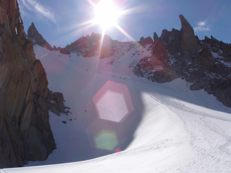 reached the Refuge- After about 20 minutes on the top, we retraced our steps down the ridge. The snow conditions had deteriorated a bit but the snow was still reasonably firm. The Refuge was passed and the Dome du Gouter descended. A late breakfast in the Gouter Refuge refuelled us, ready for the scramble down the arête and safe crossing of the Grand Couloir stone shooting gallery. Out of the grip of the Couloir, we were soon on our way back to the train station at Nid d'Aigle. |