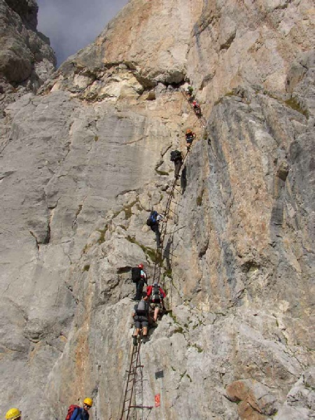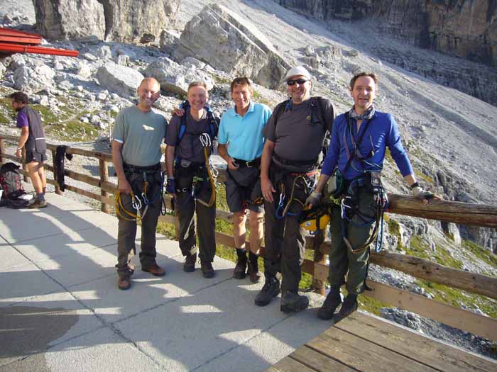 Day 2 Rif. Tuckett to Rif. Alimonta - Grade 4 seriousness C After a good nights rest the day dawned clear, promising another perfect day. Sun screen was plastered on and then our steps were retraced upwards on the Sentiero Delle Giacomo. We had decided this would be easier than climbing the Tuckett glacier and this also meant we completed the last section of the S. Alfredo Benini from the previous day. This last section turned out to be the most entertaining of the Benini route involving a series of ladders and a climb on stemples that lead to the Bocca del Tuckett. During our break for the second breakfast of the day we met up with a pair of British