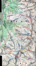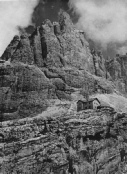 The Brenta group is the most westerly of the Dolomites and forms a lofty broken ridge stretching a distance of 12 miles. The chain of peaks is separated by a wide gap at its centre where the Groste Pass gives easy access from one side to the other. This is where the expedition started. To the south of the Pass the terrain is much shattered, decked with numerous bold rock towers and spires, splendid cliffs and all enclosed by small glaciers on the western side. It is through this amazing territory that our route was planned along a series of protected paths or via ferratas that go under the name of the Bochette Way. Scenically the Brenta is undoubtedly one of the mightiest mountain areas in Europe and the capacity to link a series of via ferratas in a hut to hut traverse of a mountain range is unique in the world. Climbing the Brenta started in the 1860's and by 1899 the final major peak, the incredible spire of Campanile Basso was conquered. From the 1930's people began to widen where necessary the horizontal rock ledges hewn out of the cliffs by wind and weather and equip them with pegs, ladders and wire ropes as a protected high level route. Over time the particular installations and connections became more and more exciting and now the Brenta is one the most popular areas in the whole of the Alps, climbers being drawn under the irresistible magic spell of the Bochette Way. |