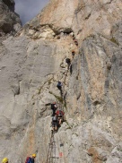 Day 3 Rif. Alimonta to Rif Agostini - Grade 3 seriousness C The third day of the trip took us from Bocca dei Armi along ledges on the eastern side of Cima Dei Sflumini, around the amazing spire of Campanile Baso and then to the western side of Cima Brenta Alta with a series of ladders and ledges transporting us through the most dramatic rock formation you could imagine. A glacier crossing was the first hurdle of the day but fortunately the snow was crisp giving a good footing and the route was very clear. A series of four ladders lead to a pleasant clean rock rib with striking views down the glacier to where we had started the day. The rock ledge then started that eventually lead all the way round to Campanile Basso which came into view after about 15 minutes more climbing. The traverse along the ledge towards the Campanile was truly memorable and took a considerable time due to the number photos and video shots taken! After a descent to the col at the bottom of the Campanile a refreshment break allowed some time to watch the rock climbers on the column. The ledge traverse then continued with the navigation of a bridge and overhanging roof until the final ladder descent to the Bochetta di Brenta and the short walk to Rif Pedrotti. At this stage it was decided to take the 320 path around to the Rif Agostini. The route through the Pozza Tramontana and the Sentiero Palmieri was a very pleasant way to finish the day. The rifugio made us very welcome and the food was the best of the 3 huts we stayed in. Highly recommended. |