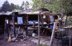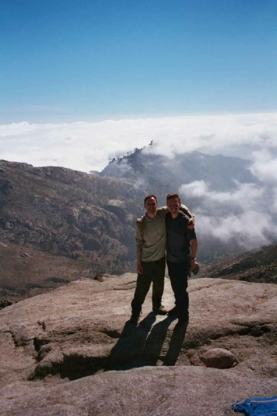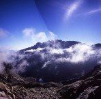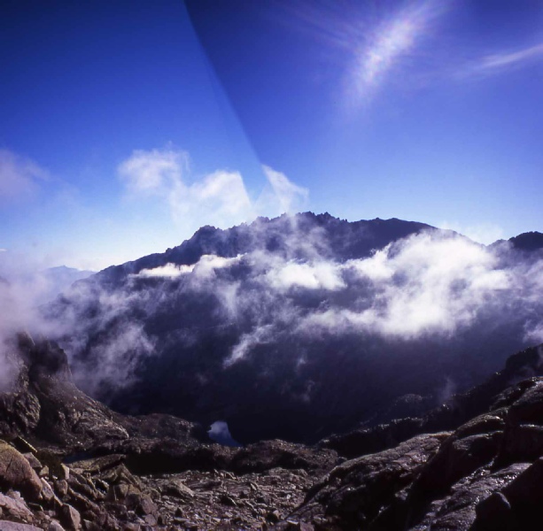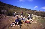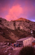 Weather forced rest day The weather closed in again during the night with strong winds and driving rain. When we emerged from the tent in the early morning we decided to stay put for the day and let it blow over. Some intrepid souls did carry on but we heard later that they got severely bashed around and one of the party was injured during a fall. Problems with this strategy included the overcrowding in the Refuge, putting up with the abuse from the Warden and the boredom. By late evening the weather appeared to be clearing and the rain had stopped. |