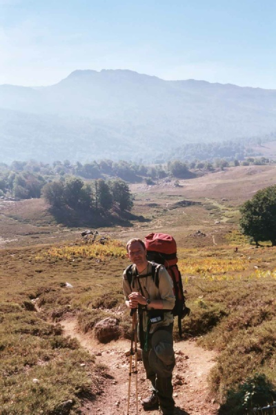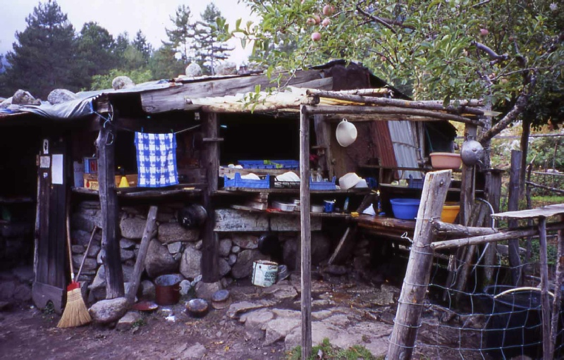 Stage 6 Hotel Castel de Vergio to Refuge de Manganu A good path zig zags up through tall beech trees to the Bocca San Pedru. We stood for a long time enjoying the wonderful view back across to the mountain terrain and the Golo valley already covered by our walk. The day turned out to be a relatively easy and we were soon at the very pleasant spot of Lac du Ninu. The Bergeries de Vaccagha had been recommended for their cheese so we bought some on our way past to the Refuge. The Refuge de Manganu was definitely a place to camp. The Refuge turned out to be a pretty miserable affair and the Warden not particularly welcoming. Time 5 hours |