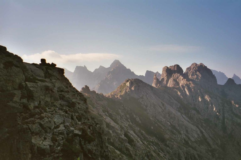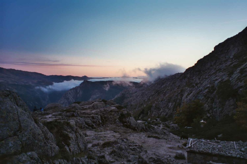 Stage 7 Refuge de Manganu to Bergeries de Tolla The day dawned clear and fresh, so with spirits revived we set off for the highest point on the GR20. The path climbed the valley behind the Refuge de Manganu to reach the Breche de Capitellu at 2,225m (7300ft). The path to the narrow rocky gap is steep in places and quite stoney and bouldery but the view when the gap was reached was amazing. Patches of mist lay in the corrie below us and two deep blue lakes were glistening in the sun as it penetrated the mist. It was definitely worth waiting for a clear spell in the weather to witness this magnificent scene. The route then cut across the steep and rocky slopes of Punta a e Porta and then onto the southern side of the ridge. Following the signs to Petra Piana, we clambered over huge boulders on the slopes of Punta Muzzella and up to the Bocca Muzella gap. The path descended to the Refuge de Petra Piana where the advice of the Warden was sought about the weather. We had intended to take the high level Alpine variant for the next sections of the route. However, after a warning from the Warden that the impending thunderstorm would make this route very dangerous, the low level route as taken. The steep descent from the Refuge was followed by a gentle walk through a valley