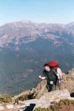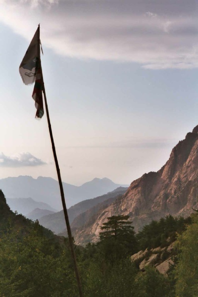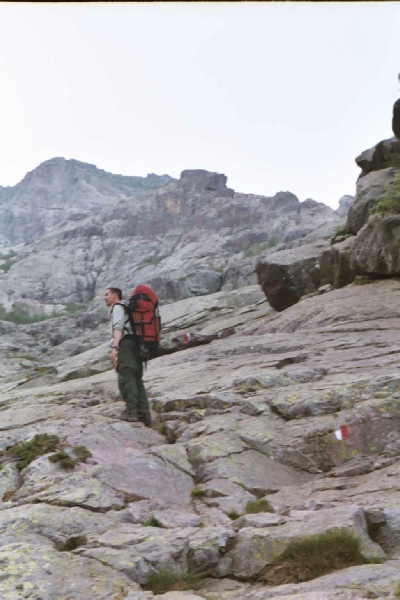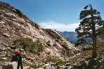 Stage 3 Refuge de Carozzu to Haut Asco Early in the day, the footbridge across the Ruisseau de Spasimata was reached. The guide says it is a wobbly bridge and we would agree with this description. Pete and myself found the bridge to be the most hair raising bit of the whole GR20 and we were glad to reach solid ground on the other side. The Spasimata slabs above the bridge were dry and their ascent presented no problems. The path contours across the valley and somewhere along this stretch of path I lost my beloved Yashica T4 camera. If anyone found one around this time its mine! A steep ascent lead to the Bocca i Stagni and the news from a French party that a storm was due to arrive tomorrow afternoon. Another long descent lead us to the ski resort of Haut Asco and a welcome beer. During a training session on the South West Coast Path in Cornwall, I had a chance meeting with an American, Rick, who was planning to do the GR20 at a slightly earlier time than us but in the opposite direction. We had calculated that we would cross somewhere near Haut Asco and there, low and behold, Rick had arrived in Haut Asco. He was full of enthusiasm for the route having had a brilliant experience on the GR20 and was really helpful in providing local knowledge for the rest of our trip. Time 6 hours |