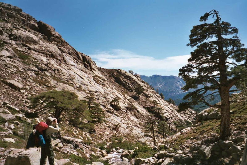 Stage 5 Bergeries de Ballone to Hotel Castel de Vergio The storm lasted most of the night and into the next morning but the trusty Terra Nova tent kept us dry. We delayed our start to let the weather clear up, but with little sign of this happening we set out for the Refuge De Ciottulu di I Mori and Hotel Castel di Vergio. This was definitely the weather low point of the trip with torrential rain, thunder and lightning. Streams that were previously a trickle now became torrents and difficult to cross. With the help of fellow walkers we safely crossed the strongest stream only to hear later than a walker following us had been swept away and was severely shaken but fortunately not seriously hurt. By the time we had reached the Refuge de Ciottulu di I Mori, the rain had cleared and we started the drying out process. The Golo valley below had some wonderful laricio pines and the descent by the river through the valley after the rain storm was one the highlights of the trip. The campsite at Hotel Castel de Vergio will win no prizes for prettiness but the food in the restaurant was excellent. Time 7 hours |