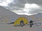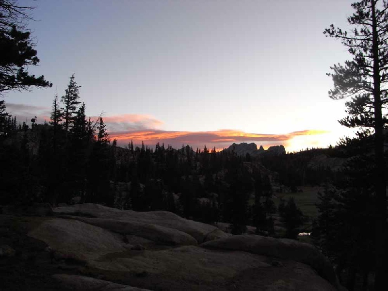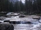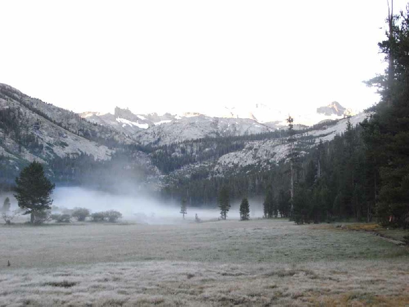 Day 2 Sunrise High Sierra Camp to Upper Lyell Canyon Total distance of day 19 miles Total ascent of day 1600ft The first night was surprisingly cold and I woke to find my water bottle frozen and the tent lined with frost. I got into the routine of an early start, waking at 4:45 with the aim of getting on the trail by 6 in the morning. This is a pattern I kept to for most of the Trail and it worked very well. The first part of the day involved climbing Cathedral Pass and then dropping down to Tuolumne Meadows. The Grill in the Tuolumne village does a brilliant bacon and cheese burger which helped the calorie intake enormously. A very pleasant afternoon was spent walking along the Lyell Fork River until the path started to climb which is where I camped for the night. |
