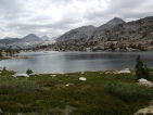 Day 11 McClure Meadow to Big Pete's Meadow Total distance of day 15 miles Total ascent of day 2500ft Today's route ascended the Muir Pass. Standing at 11995ft, this was the highest point so far on the Trail. The high point on the pass is marked by a shelter built by the Sierra Club in 1930 for only emergency use. A series of wonderfully clear lakes were passed on the way to the top of the pass including Evolution, Sapphire and Wanda Lakes. The shelter was reached and I was ready for a welcome snack stop. Jim and Jeremy introduced themselves in the shelter. We compared notes about the weight of our rucksacks and I tried to work out why I was carrying twice as much as they were ! After the pass I entered a barren, impressive and fragile high mountain landscape.