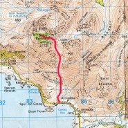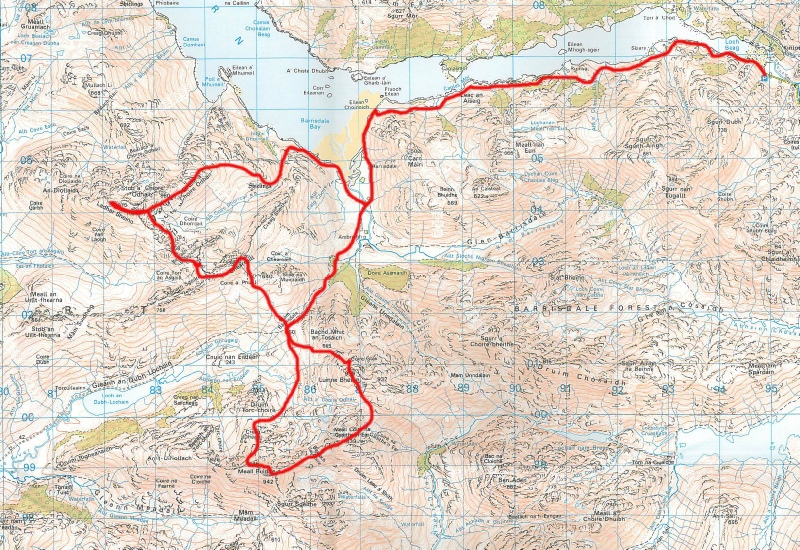 The walk in to Barrisdale was quite muddy and there is a significant amount of ascent on the coastal route. Finally the bothy was reached at Barrisdale . A chat with the warden of the bothy confirmed the remoteness of the site with a description of having to take to boat over to Mallaig or Kyle of Lochalsh to do the shopping. The ascent of first Munro, Luinne Bheinn, was mostly on the track that links Barrisdale and Inverie but the last part of the ascent was taken with the aid of the compass due to the mist. The weather however improved after the summit and the path to the second Munro, Meall Buide, became clear. This was reached in the late afternoon. The descent to the bealach Mam Barrisdale was a long affair and it was with some relief when the ascent of Ladhar Bheinn was started on the far side of the belach. The face of Stob a Chearcail looked quite intimidating and it was only when up close that the path though the face became obvious. The continuation of the ridge to the summit of Ladhar Bheinn involved some mild scrambling and a considerable amount of up and down and the summit was finally reached at about nine in the evening. A site of the bivi was then needed to bed down for the night and this was achieved at the 960m spot height on a very flat and pleasant stretch of grass. A good night’s sleep then followed. The walk out back to Kinloch Hourn the next day was very pleasant and I was back at the car for the return to York by about eleven in the morning.