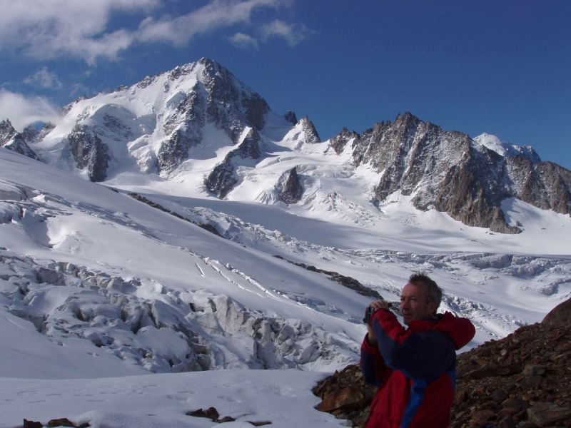 reached the Refuge- After about 20 minutes on the top, we retraced our steps down the ridge. The snow conditions had deteriorated a bit but the snow was still reasonably firm. The Refuge was passed and the Dome du Gouter descended. A late breakfast in the Gouter Refuge refuelled us, ready for the scramble down the arête and safe crossing of the Grand Couloir stone shooting gallery. Out of the grip of the Couloir, we were soon on our way back to the train station at Nid d'Aigle. |