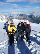 Day 3 Climb of the Petite Fourche and on to the Triente Refuge Our first Alpine start, at 5am, saw us onto the glacier above the Albert Premier Hut. Crampons were strapped on and we started up towards the col beneath the Petite Fourche (3520m). The weather was variable, bright and sunny at times, then snowy with very limited visibility at others. The scramble to the summit was somewhat congested with a number of different parties jostling for position. After the descent from the summit and with the weather closing in, an abseil down an ice wall took us into Switzerland. The wonderful Plateau de Trient was crossed and after a final ascent, we were safely lodged at the Trient Refuge(3170m). A huge lunch of rosti potatoes was followed by a welcomed siesta. |