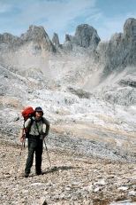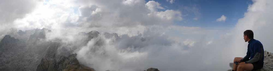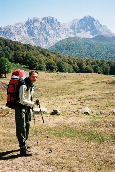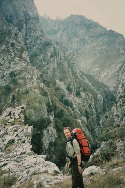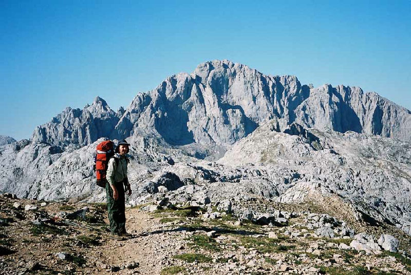 west to east, taking in the best it has to offer. Stop- The guide "Picos de Europa walks and climbs" by Robin Walker was used to help plan the route. A series of multiday walks are outlined at the back of the book, the inspiration for the route being the "Traverse of the Three Massifs". Although consulted at the planning stage, the lack of detail and maps meant the guide was not found to be very useful on the trip. The book was first published in 1989 and has not been radically updated since then. Up to date route information on path conditions was gleaned from the wardens of the refuges. Trip members were Peter and David. Further pictures are here. A DVD of the expedition is available for those planning to walk in the Picos de Europa. |