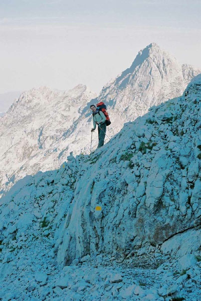 Stage 1 Soto de Sajambre - After a good nights rest in a pensione in Cangas de Onis, a taxi journey took us to the start of our walk at Soto de Sajambre. The track from the village went gently up through fields and then more steeply through woods towards the Refugio de Vegavano. The weather was incredibly hot and the stop at the refuge for a drink was a welcome relief from the weight of our packs. The refuge looked very welcoming and a stay at the refuge will definitely form part of a future trip to the Picos. The path above the refuge was wooded for a time, passing an impressive oak tree. The woods were cleared at Collado El Cueto and a broad grassy spur followed round the big walls of Los Moledizos. The path steepened and the first set of screes encountered on the Canal del Burro. The rocky route to Vega Huerte was well marked with yellow flashes and cairns. The campsite location is wonderful with magnificent views of the South Face of Pena Santa de Castilla. A water pipe spring is sited just below the campsite. A fine evening followed watching the sun set and the full moon rise up. Time : 7 hours |