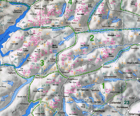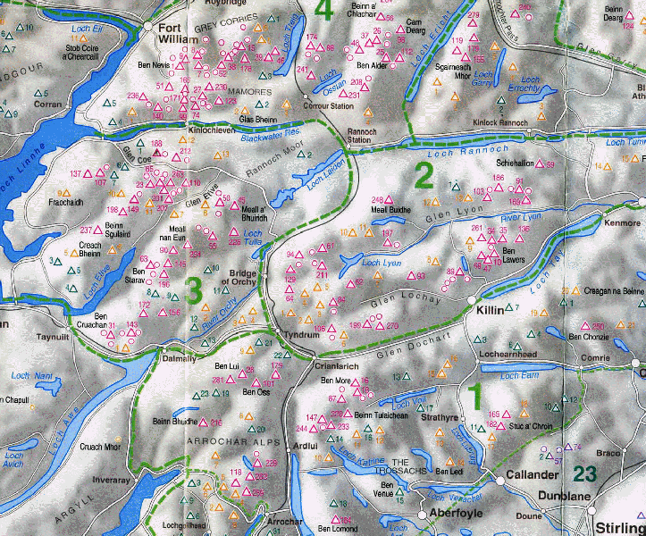 The Southern Highlands has been taken as the area from Loch Lomond in the south to Ben Nevis in the north and bounded by the Lawers Group in the East.
