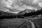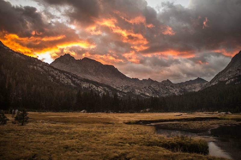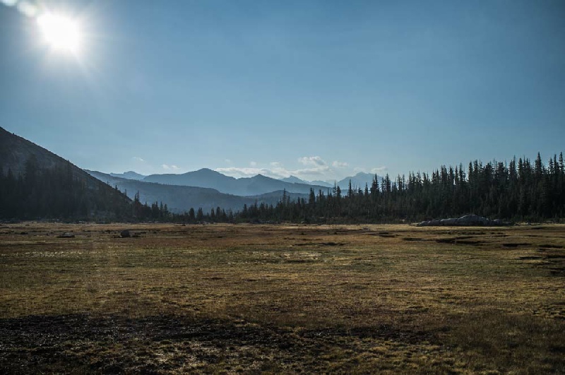 The day started with rain and it continued to rain of and on all through the day. The Trail headed southwards along the very beautiful San Joaquin Valley to enter the Kings Canyon National Park. At Franklin Meadow, a major fork in the trail was reached and the substantial ascent into Evolution Valley brought us to the river crossing at Evolution Meadow. The path on the northern bank of the river then gradually climbed to the very lush McClure Meadow. The rain was very heavy as we set up our camp but fortunately it stopped at around 6 in the evening to allow wet tents and clothes to dry out before the next day. A very memorable evening was spent gazing up at the wonderful panorama of the cirque of mountains.