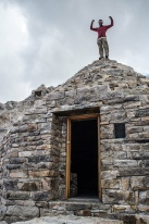 Today's route ascended the Muir Pass. Standing at 11995ft, this was the highest point so far on the Trail. The high point on the pass is marked by a shelter built by the Sierra Club in 1930 for emergency use only. A series of wonderfully clear lakes were passed on the way to the top of the pass including Evolution, Sapphire and Wanda Lakes. The shelter was reached and pictures were taken of members of the party perched on the top of the shelter.