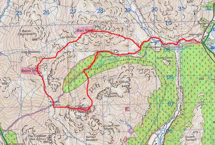 After an early start and drive up to Loch Lomond, the 3 Munros aound the head of Coiregrogain were completed in an afternoon. After the steep ascent of Ben Vane, a fair amount of descent and ascent was needed to reach the second Munro of the day, Beinn Irme. A straightforward descent of Beinn Irme lead to the bealach and 300m of ascent to the final Munro of the day Beinn Narnain. Wonderful views down Loch Long to the Kyles of Bute were enjoyed then the steep descent back to the road tackled. A fine day. |