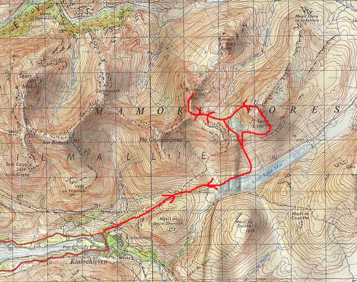 and the stalkers path taken to the col between Binnein Mor and Beag. The ascent of