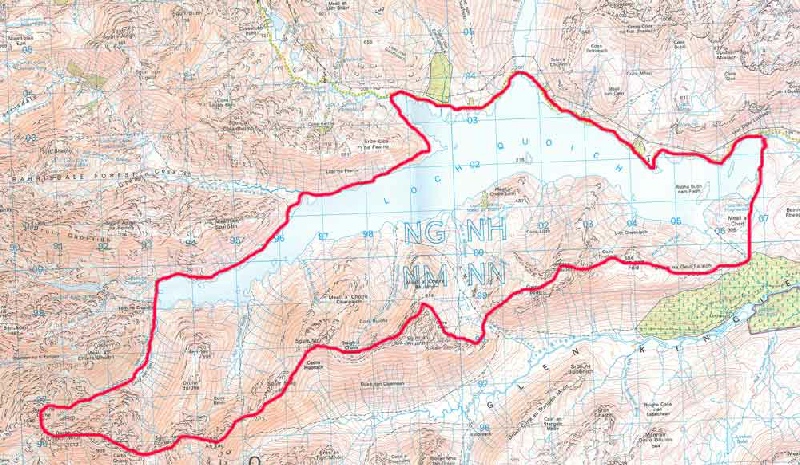 The route directs around Loch Quoich, starting from the Quoich dam and takes in